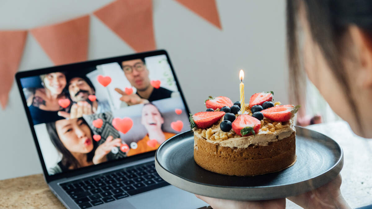 Young Woman Celebrating Birthday With Friends On A Video Call Using Laptop