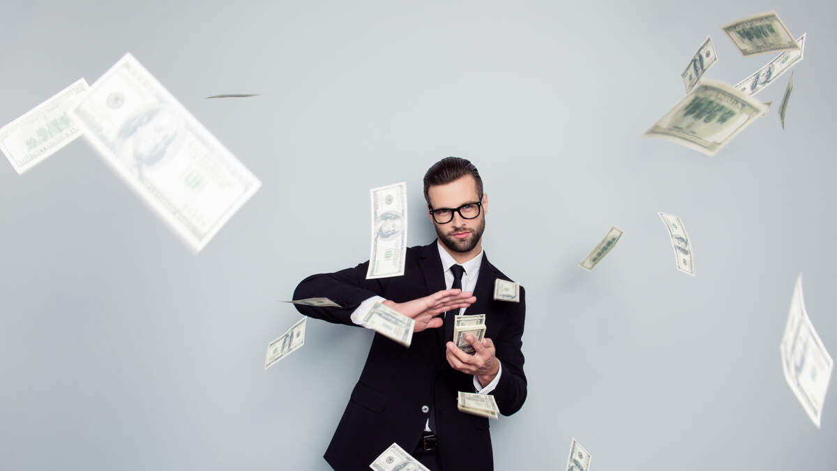 Spectacles jackpot entrepreneur economist banker chic posh manager jacket concept. Handsome confident cunning clever wealthy rich luxury guy holding wasting stack of money isolated on gray background