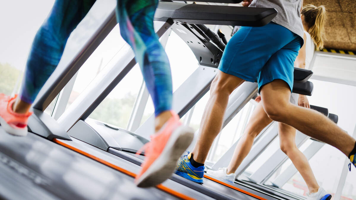 Healthy man and woman running on a treadmill in a gym