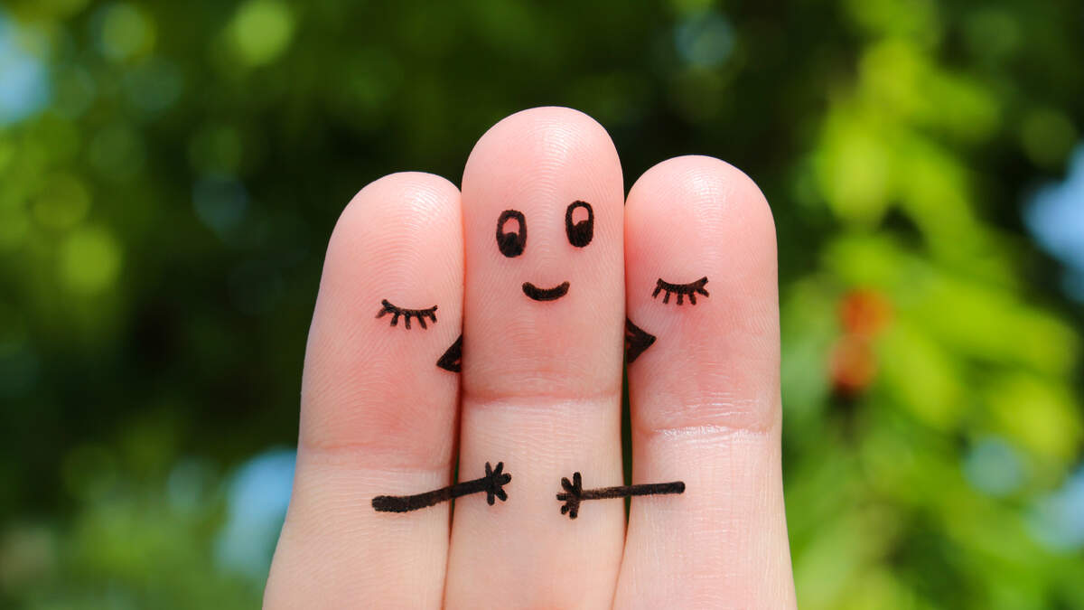 Finger art. Two women kissing a man.