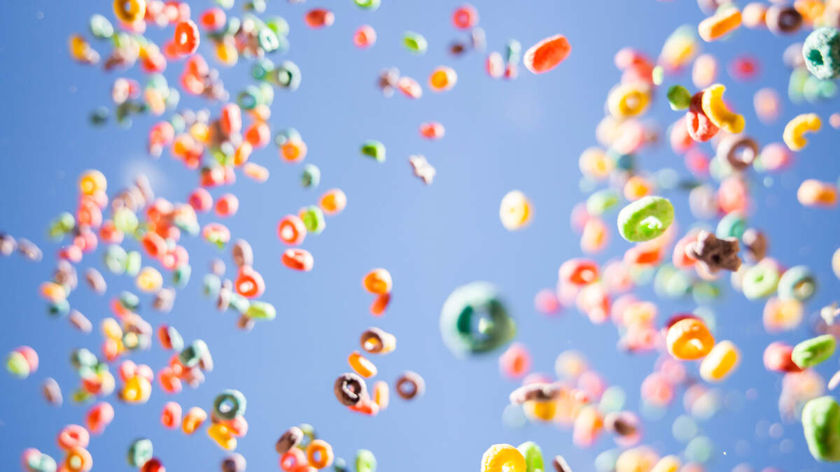 Colorful fruit loops cereals levitating in the sky in a beautiful visual effect.