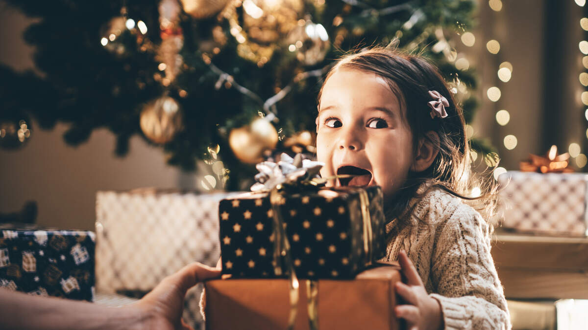 Lovely little girl receiving a Christmas gift.