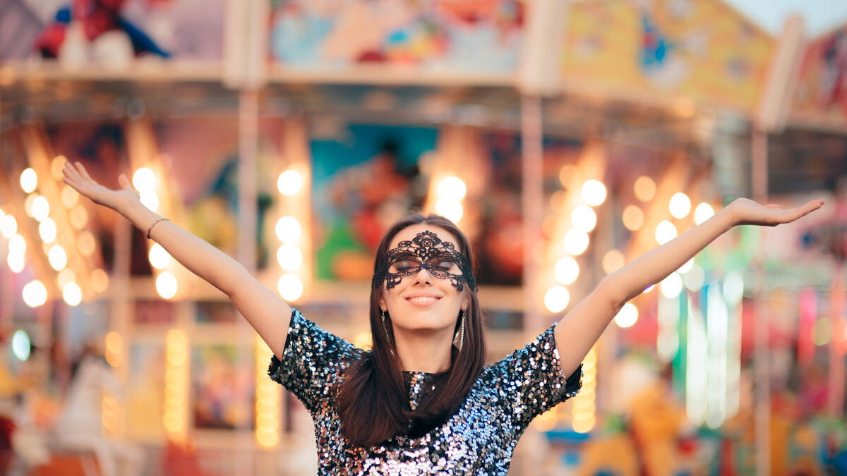 Woman Wearing carnival Mask at Funfair Amusement Park