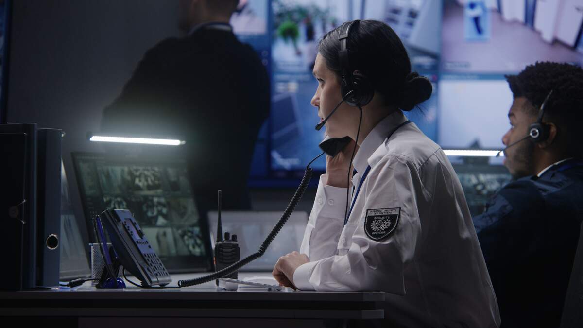 Female officer works on computer in police monitoring center