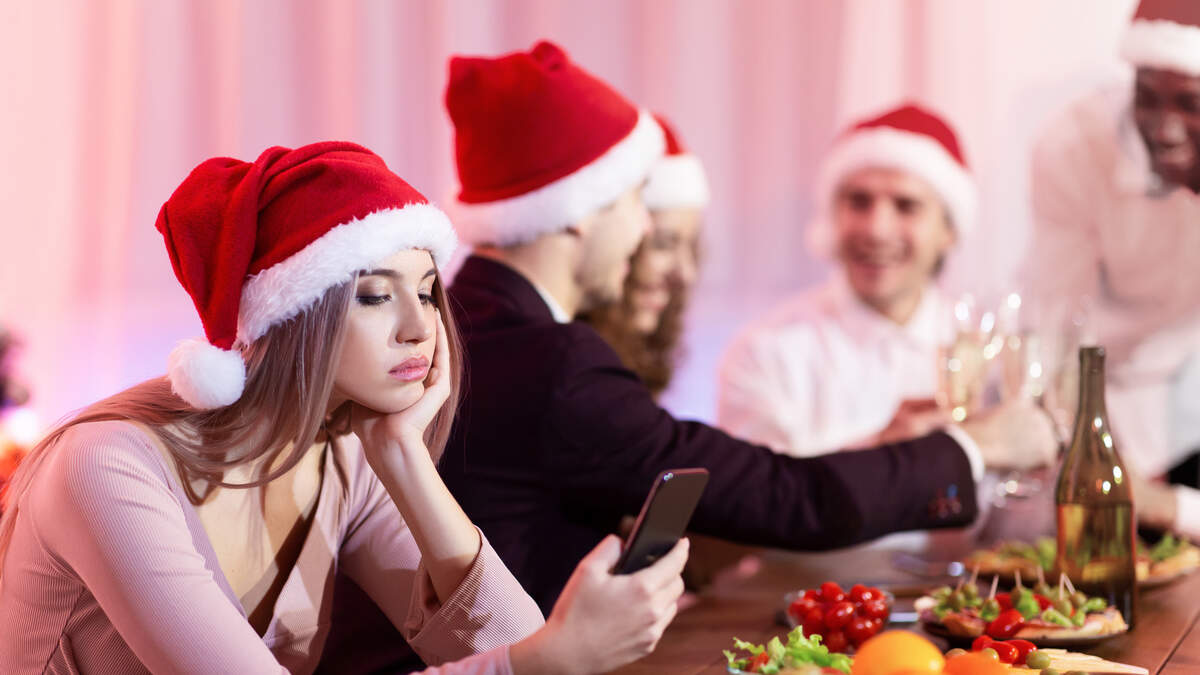 Bored Girl Using Smartphone Celebrating Xmas With Friends At Home