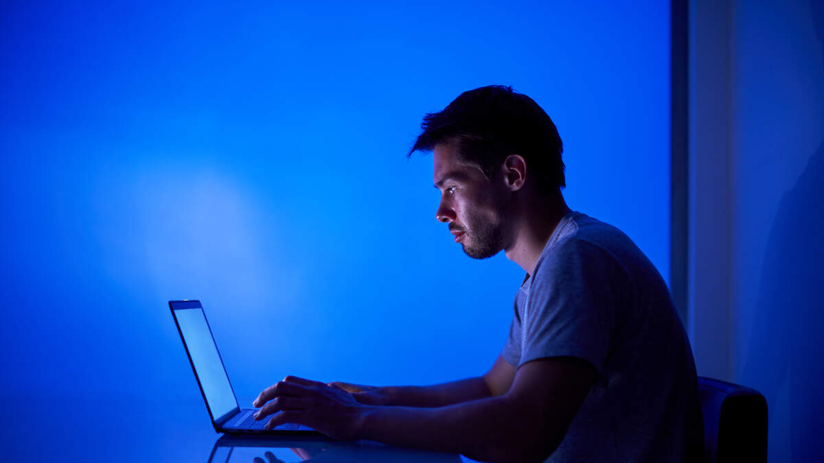 Hacker tries to break security system to steal important company information, working at laptop in blue neon light